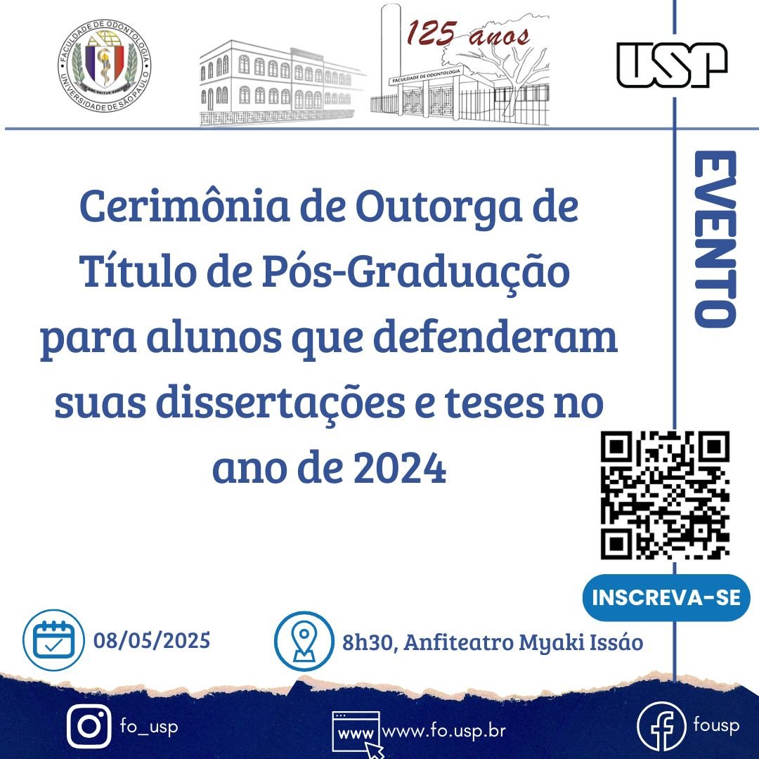 ![]() Neste evento, a Profa. Dra. Mutlu Özcan, diretora do Centro de Medicina Dentária da Universidade de Zurique (Suiça), abordará os avanços mais recentes em biomateriais, promovendo uma discussão aprofundada e atualizada no contexto da Pós-Graduação, além de explorar oportunidades para o desenvolvimento de possíveis projetos de colaboração acadêmica. O evento será exclusivamente no formato presencial, […] |